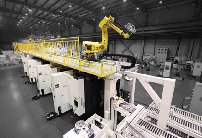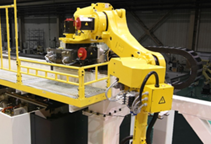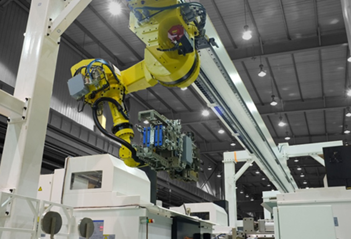 ◎機(jī)器人置于機(jī)床頂部,節(jié)省客戶工廠占地面積 ◎應(yīng)用下探式關(guān)節(jié)機(jī)器人,擁有了豎直方向的大工作區(qū)間,可將多個(gè)輔助裝置立體分布 ◎機(jī)器人附加第七軸控制,自由擴(kuò)展移動(dòng)范圍服務(wù)多臺(tái)機(jī)床 ◎選用抓取重量150kg以上的大規(guī)格機(jī)器人 適用范圍: ◎適合臥式加工中心單側(cè)布線 ◎主要針對(duì)中型殼體類零件